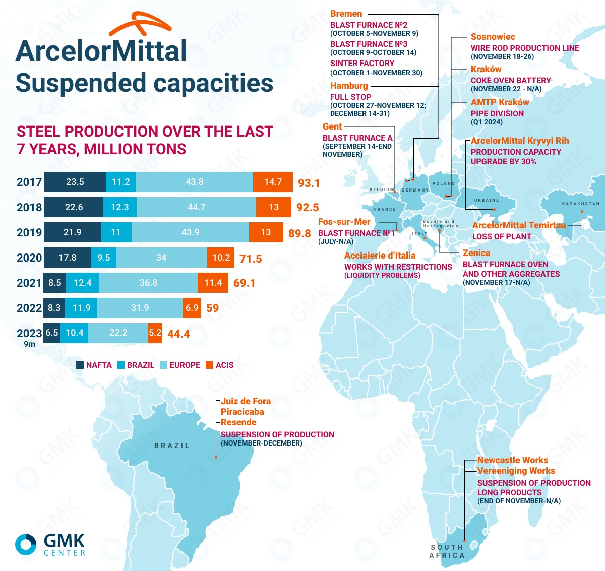 ArcelorMittal'in 2023'ün dördüncü çeyreğinde sonuçlarının kötüleşmesi muhtemel görünüyor, çünkü şirket, sonbaharın başından itibaren özellikle Belçika, Fransa, Almanya ve Bosna-Hersek'teki tesislerinde Avrupa operasyonlarını askıya almaya veya azaltmaya başladı. Askıya alınan kapasiteler, Belçika'daki BF A, Fos-sur-Mer'deki (Fransa) BF No. 1, Zenica'daki (Bosna-Hersek) BF ve haddehaneler ile Krakow'daki kok fırınlarını içeriyor. Hamburg ve Bremen'deki (Almanya) ve Sosnowiec'teki (Polonya) tesislerinde bazı üniteler sonbahar ve kış dönemlerinde geçici olarak kapatıldı. Şirket, karlı olmadığı için Polonya'daki boru bölümünü kalıcı olarak kapatmaya karar verdi.